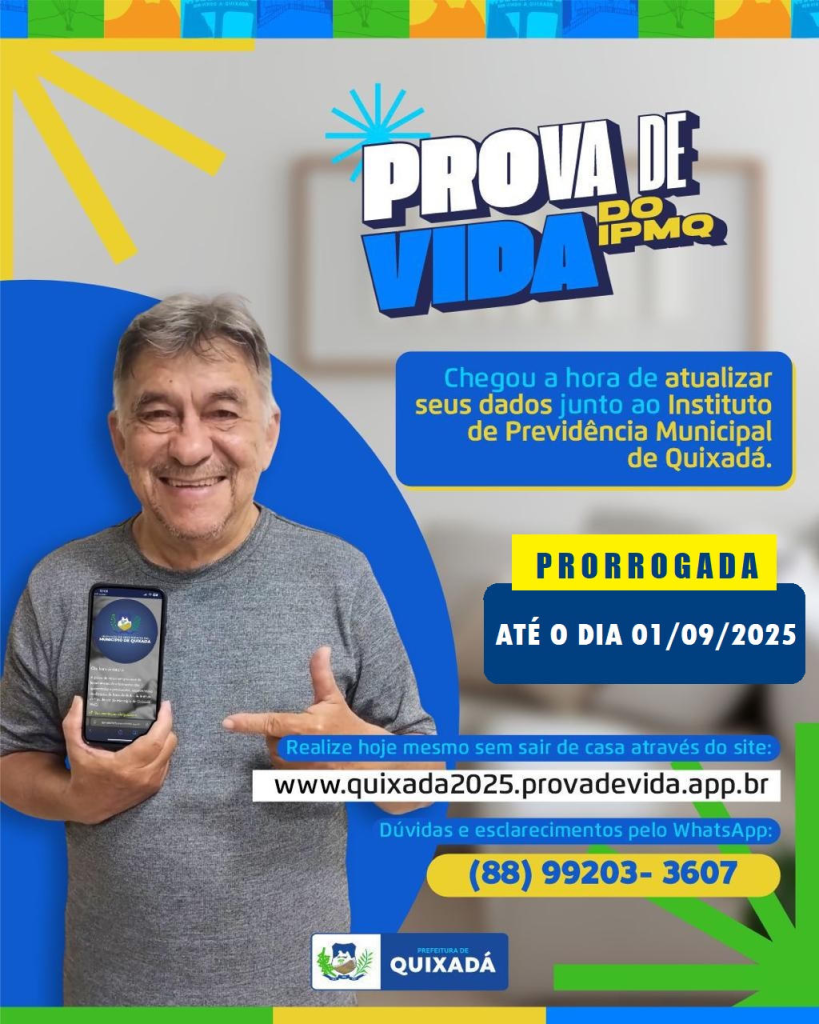 Fica prorrogado, no âmbito do Município de Quixadá, a realização da prova de vida/recadastramento dos atuais segurados inativos e pensionistas incluídos na Folha de Pagamento do IPMQ até o dia 01 de setembro de 2025.